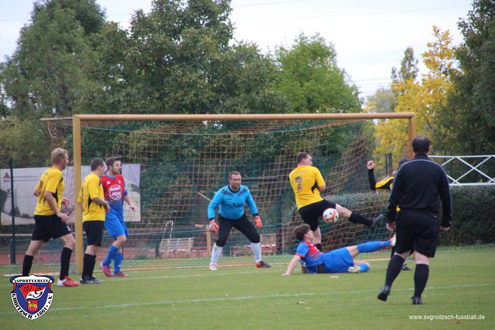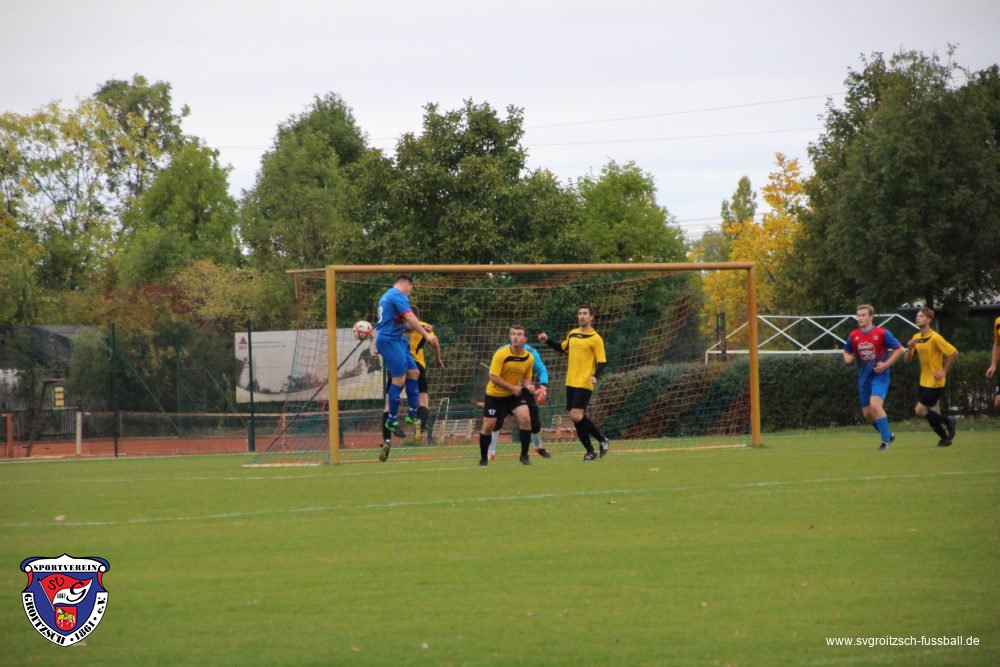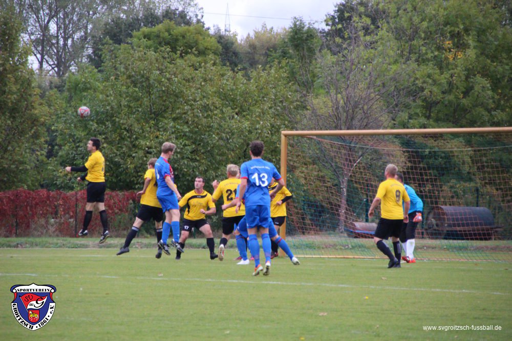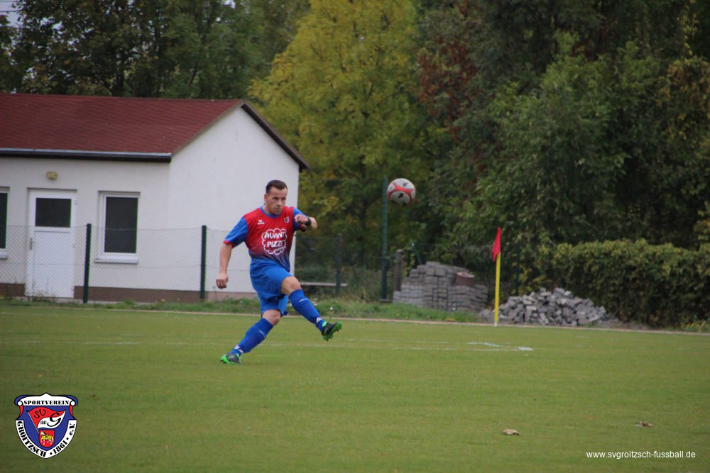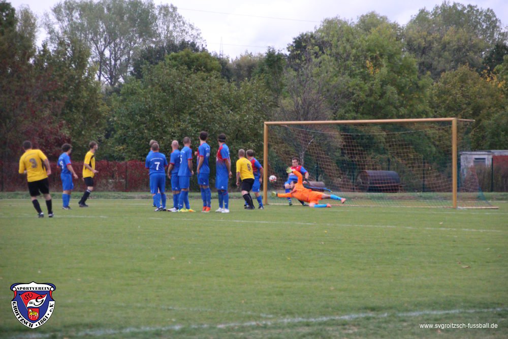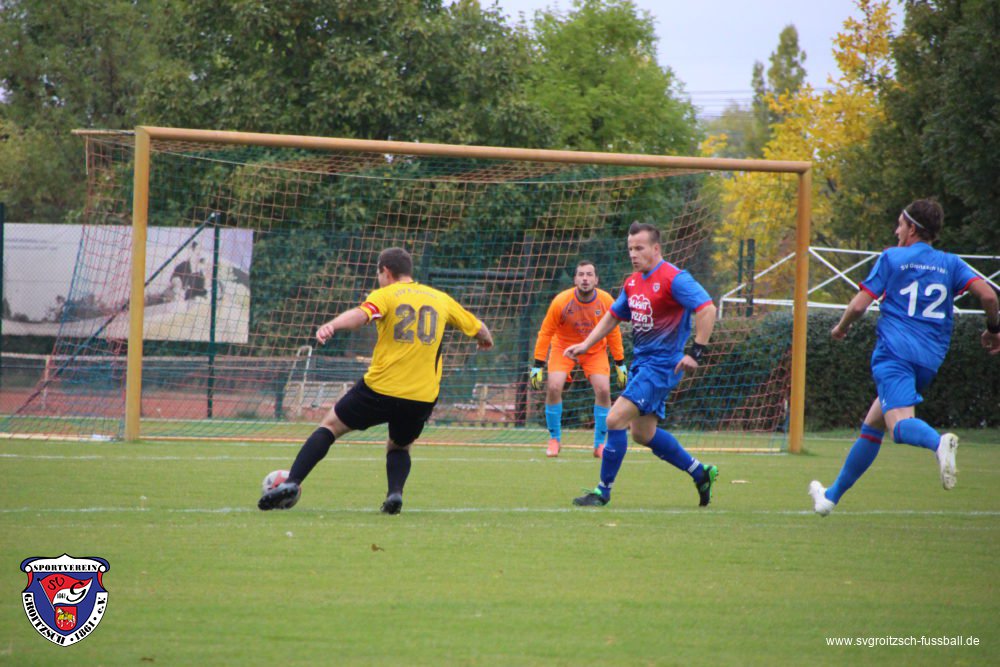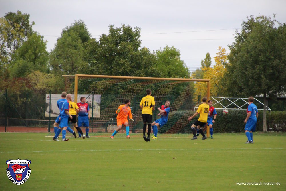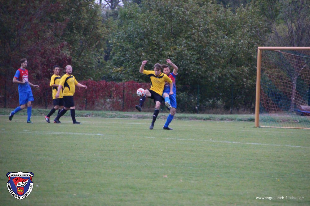 Die Gäste aus Kitzscher legten ab Minute eins los wie die Feuerwehr und die Schusterstädter hatten in den ersten 10 Minuten Glück, dass die „Null“ noch stand. Zu allem Überfluss verletzte sich Frank Zimmermann in der 10. Spielminute und musste den Platz unplanmäßig früh für Christian Kalb verlassen. Die Groitzscher fanden danach kurzzeitig ins Spiel und entfachten ein paar gute Angriffe, die jedoch vor dem Gäste-Tor ohne Torerfolg endeten. Kitzscher hingegen nahm das erste Geschenk in Minute 16 dann dankend an. Eine von rechts geschlagene Flanke war eigentlich viel zu hoch angesetzt, aber der Kitzscheraner Marcel Kroll hielt seinen Kopf noch hin und der ball flog als Bogenlampe mit einer irren Flugbahn ins lange Toreck, 0:1. Damit war das kurze Aufflammen der Heimmannschaft auch gleich wieder erloschen und man stellte das Fussballspielen wieder ein. Es mangelte an Einstellung und Willen, stattdessen holte man sich früh 2 gelbe Karten und war fortan in 2 wichtigen Positionen gelb-rot gefährdet. Kitzscher war dann permanent gefährlich wobei diese Chancen zumeist aus der Unzulänglichkeit der Groitzscher Mannschaft resultierte. Das nächste Geschenk nahm dann wieder Kroll entgegen, eine Ecke flog flach durch den gesamten 5-Meter-Raum, am langen Pfosten stand Kroll und freute sich über den Doppelpack.