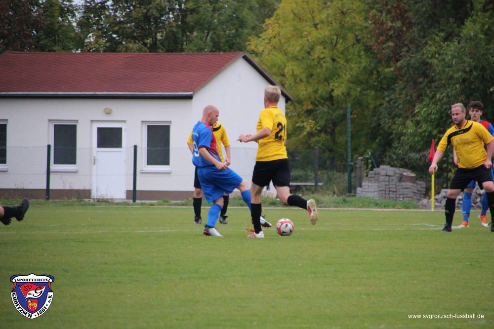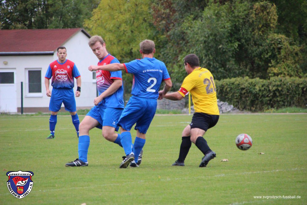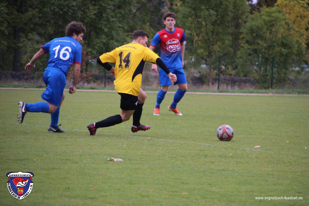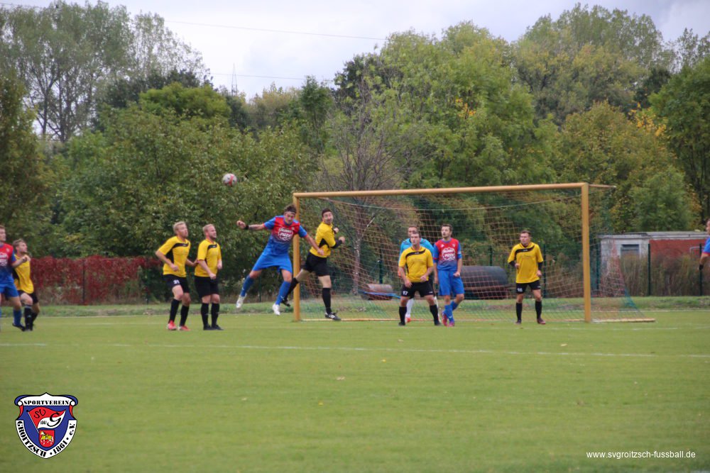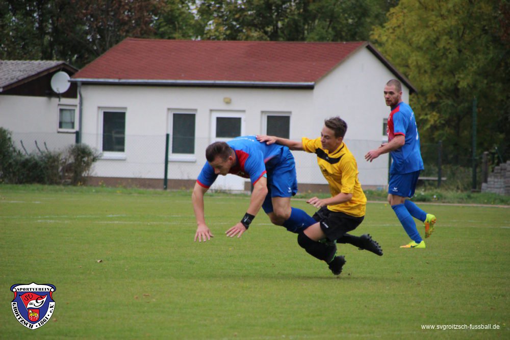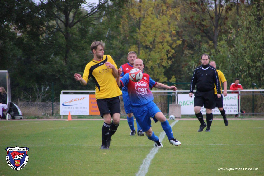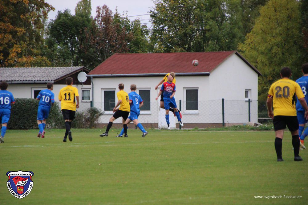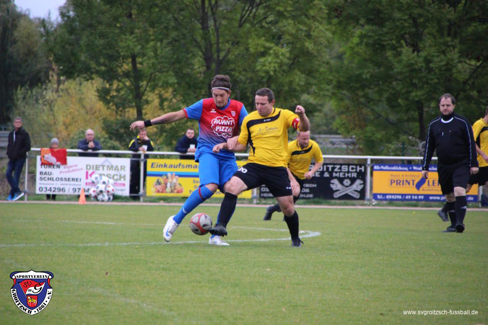 Die Gäste aus Kitzscher legten ab Minute eins los wie die Feuerwehr und die Schusterstädter hatten in den ersten 10 Minuten Glück, dass die „Null“ noch stand. Zu allem Überfluss verletzte sich Frank Zimmermann in der 10. Spielminute und musste den Platz unplanmäßig früh für Christian Kalb verlassen. Die Groitzscher fanden danach kurzzeitig ins Spiel und entfachten ein paar gute Angriffe, die jedoch vor dem Gäste-Tor ohne Torerfolg endeten. Kitzscher hingegen nahm das erste Geschenk in Minute 16 dann dankend an. Eine von rechts geschlagene Flanke war eigentlich viel zu hoch angesetzt, aber der Kitzscheraner Marcel Kroll hielt seinen Kopf noch hin und der ball flog als Bogenlampe mit einer irren Flugbahn ins lange Toreck, 0:1. Damit war das kurze Aufflammen der Heimmannschaft auch gleich wieder erloschen und man stellte das Fussballspielen wieder ein. Es mangelte an Einstellung und Willen, stattdessen holte man sich früh 2 gelbe Karten und war fortan in 2 wichtigen Positionen gelb-rot gefährdet. Kitzscher war dann permanent gefährlich wobei diese Chancen zumeist aus der Unzulänglichkeit der Groitzscher Mannschaft resultierte. Das nächste Geschenk nahm dann wieder Kroll entgegen, eine Ecke flog flach durch den gesamten 5-Meter-Raum, am langen Pfosten stand Kroll und freute sich über den Doppelpack.