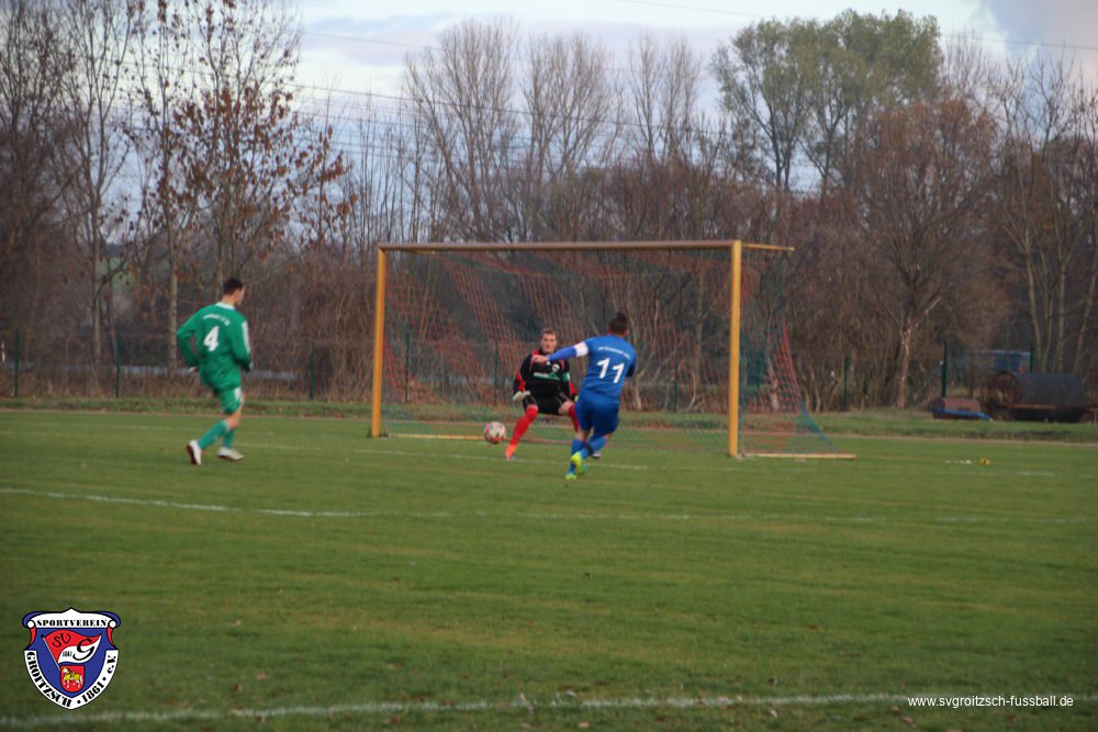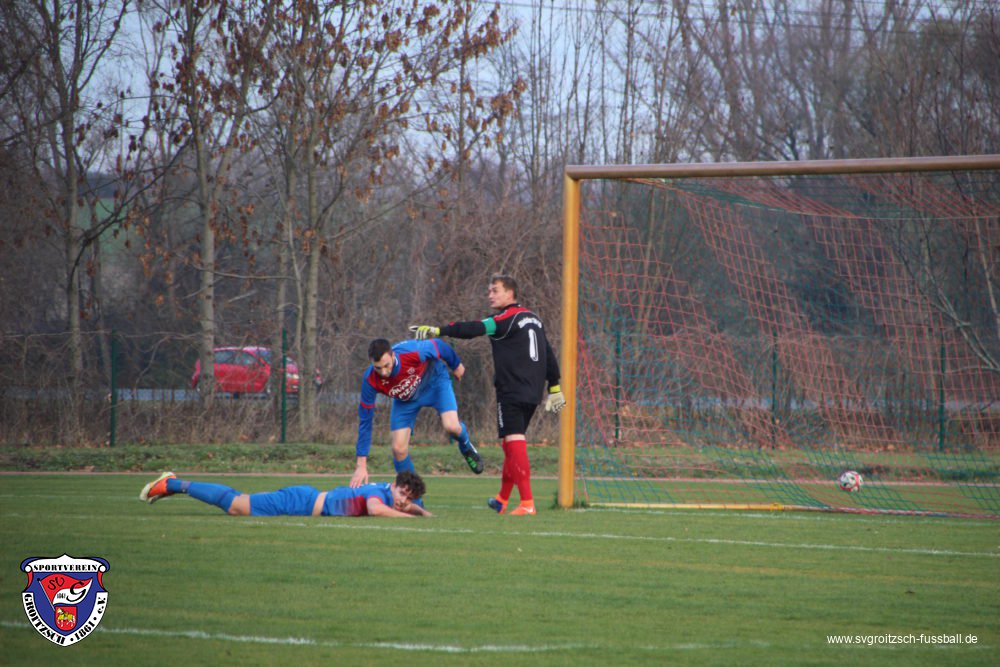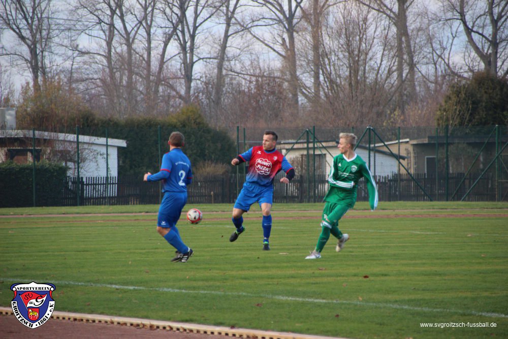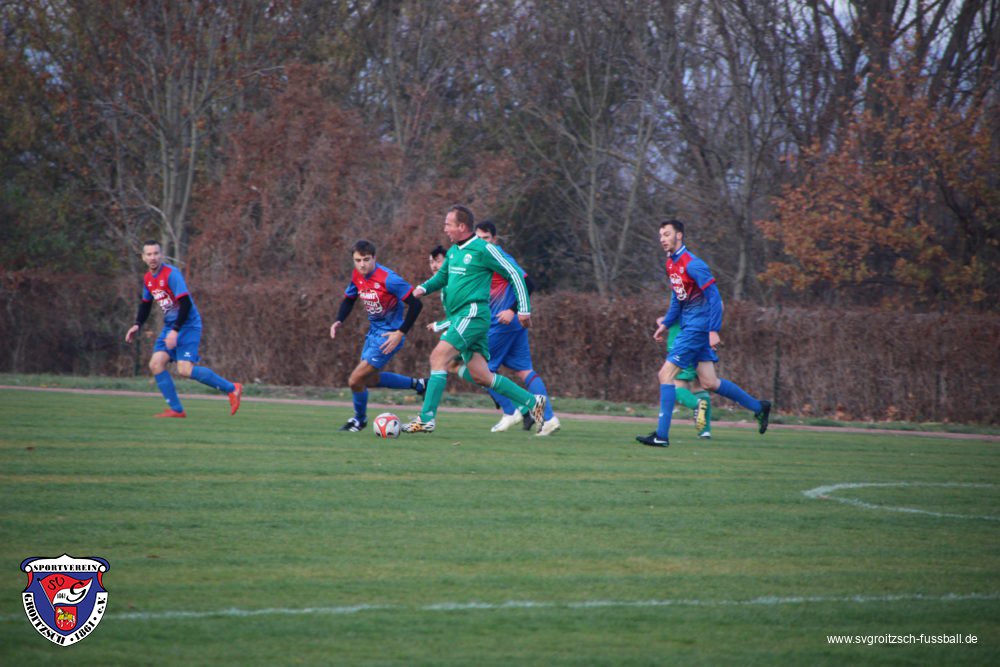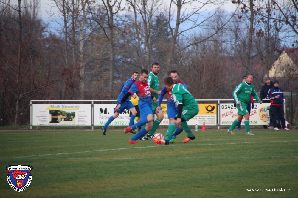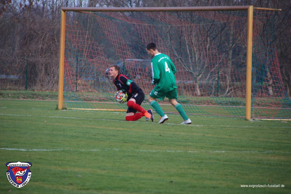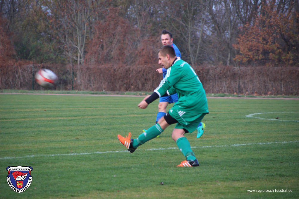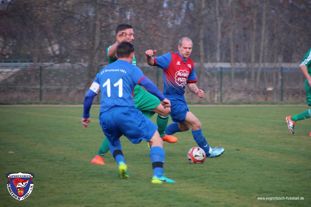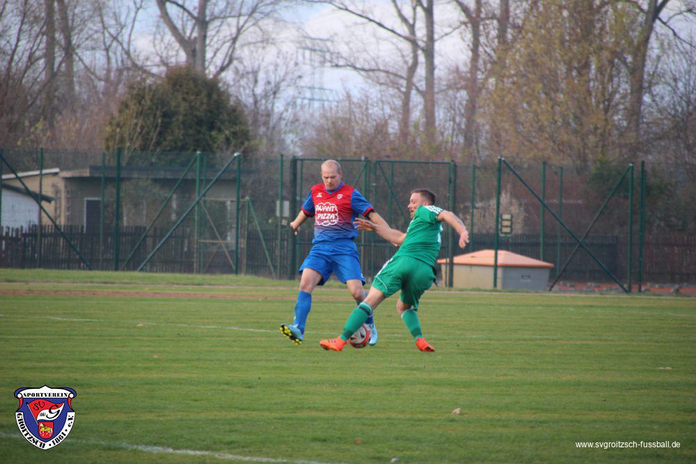 Die Heimelf startete fulminant und erarbeitete sich klare Feld- und Chancenvorteile. Thierbach hatte nichts zu melden und die erste 100%-ige Chance hatte nach einem Foul-Elfmeter André Weidlich. Doch diesem versagten in der 5. Minute die Nerven und der Gäste-Hüter hält diesen. Unbeirrt geht es für die Schusterstädter weiter. Quasi Chancen im Minutentakt und in der 8. Minute war es soweit. Nach einer Ecke, Kopfball Paule – Hüter hält, Alu Schuss – Hüter hält, aber Charly Weiß steht bereit und trifft zum 1:0. Weiter rollte der Groitzscher Express und der beste Thierbacher stand auch noch dummerweise im Tor. Dieser hielt zum Teil unhaltbare und machte das Spiel seines Lebens. Paul Dittrich erhöhte dann in der 23. Minute zum 2:0 und krönte damit seine zum Teil sehr guten Leistungen der vergangenen Spiele. Unser Paule scheint wieder der alte zu sein und ist eine echte Stütze im Moment. Ab dem 2:0 schaltete die Heimelf unerklärlicherweise wieder einen Gang zurück und Thierbach konnte sich hin und wieder befreien.